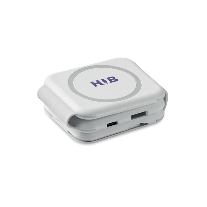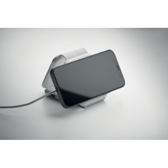 Base de carga magnética ABS. 3 puntos de carga inalámbrica. 1 x 15W, 1 x 5W para TWS y 1 cargador Apple watch (3W). 2 HUBS Tipo-C y 2 USB-A. Entrada de cable integrada: conector de Tipo-C a USB-A.