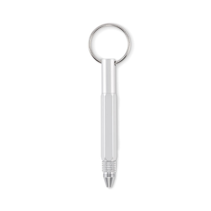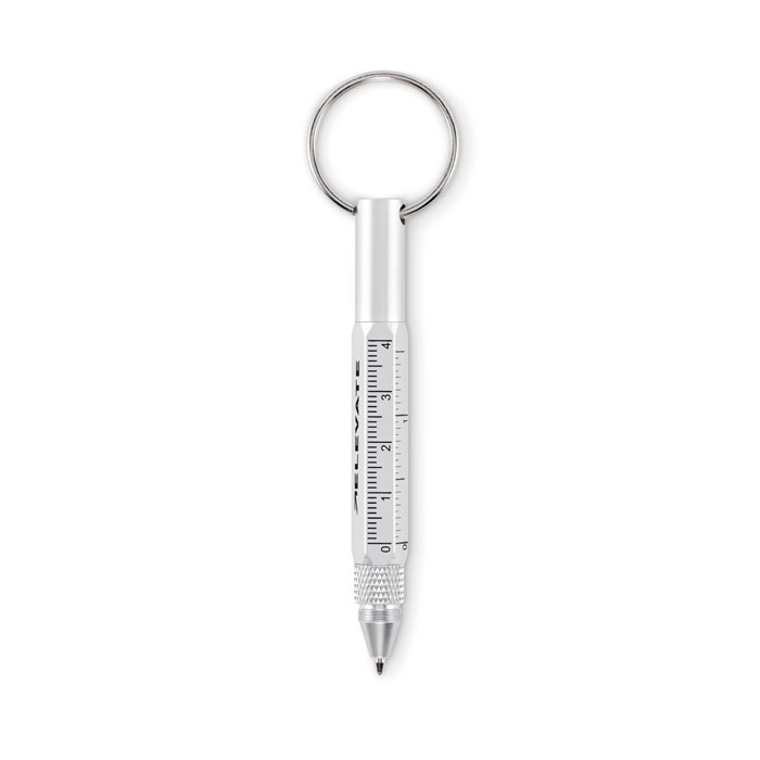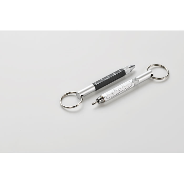 Llavero herramienta con bolígrafo giratorio de aluminio reciclado con regla de 4 cm y 1,5 pulgadas, lápiz óptico y destornillador 2 en 1 de cabeza plana y Phillips. Tinta negra.