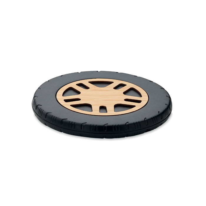 Cargador inalámbrico de 15 W en ABS reciclado y tapa de bambú. Diseño de neumático de coche. Conecta el dispositivo al ordenador, coloca el smartphone encima y deja que se cargue. Salida: DC 9V/1.10A (15W) para carga rápida.