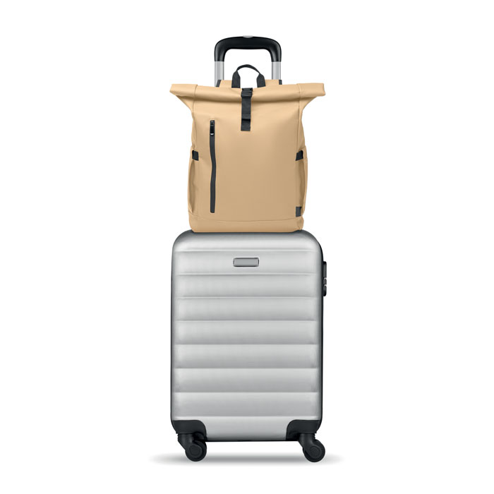 Mochila con cierre rolltop para portátil de 15'' en RPET 600D revestido de PU y forro de poliéster RPET. Espalda acolchada con malla, bolsillo con cremallera y correa para trolley. Bandolera acolchada con acabado interior de malla.