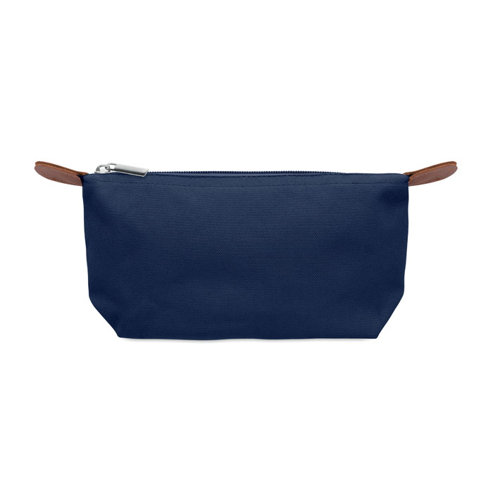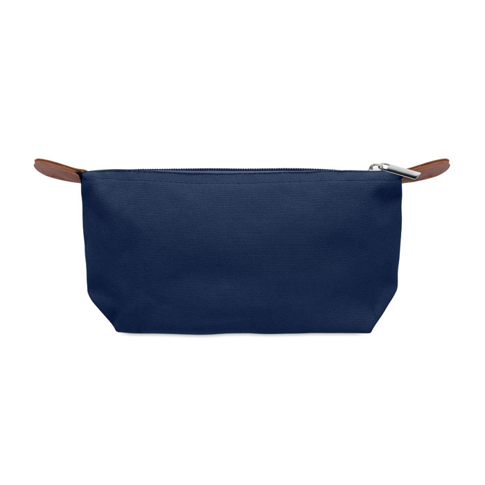 Neceser de poliéster RPET 600D con cierre superior de cremallera y detalle de PU marrón.