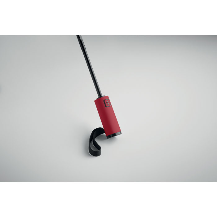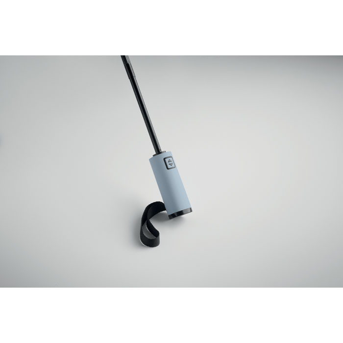 Paraguas plegable antiviento automático de 23 pulgadas de pongee RPET de 190T y funda a juego. Estructura totalmente chapada en negro, varillas de fibra de vidrio y mango de ABS con acabado de goma.