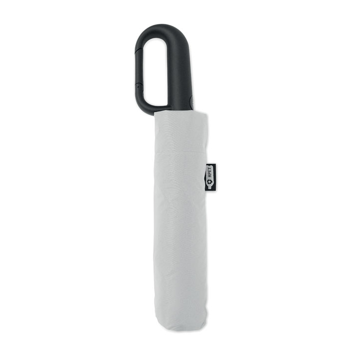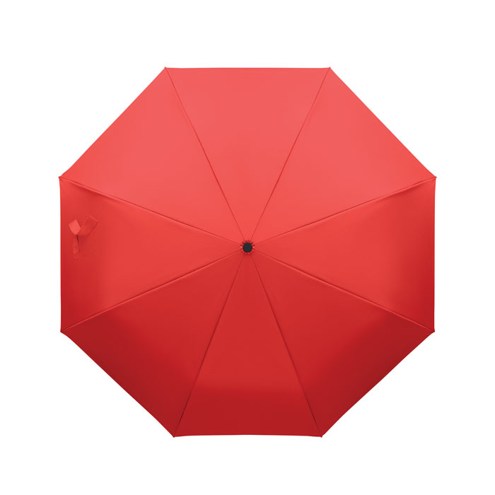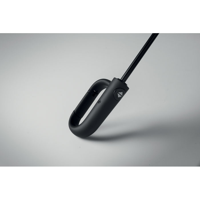 Paraguas antiviento plegable de 21'' con estructura de fibra de vidrio de 2 secciones totalmente chapada en negro. Costillas de fibra de vidrio. Paneles de RPET pongee 190T. Mango de mosquetón con acabado de goma. Apertura y cierre automáticos. Incluye funda